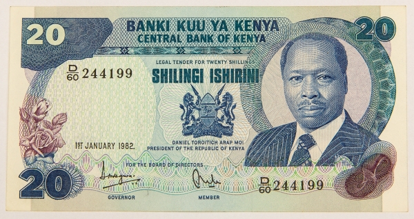 • Numismática, KENYA. Uma Cédula 20 Shillings 1982 Flor de Estampa