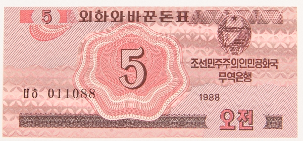 • Numismática, KOREA. Uma Cédula 5 Won 1988 Flor de Estampa