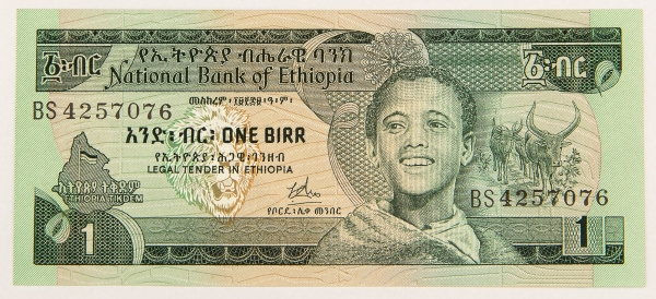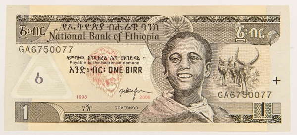 • Numismática, ETHIOPIA. Uma Cédula 1 Birr Flor de Estampa