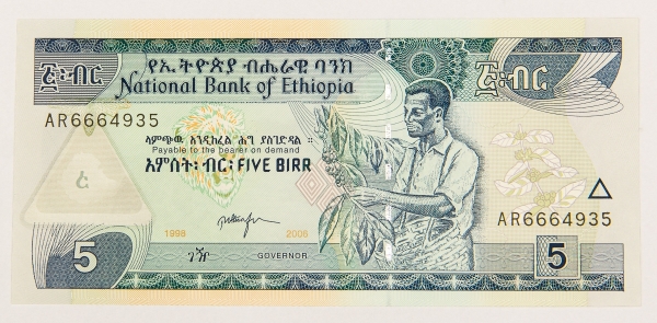 • Numismática, ETHIOPIA. Uma Cédula 5 Birr Flor de Estampa