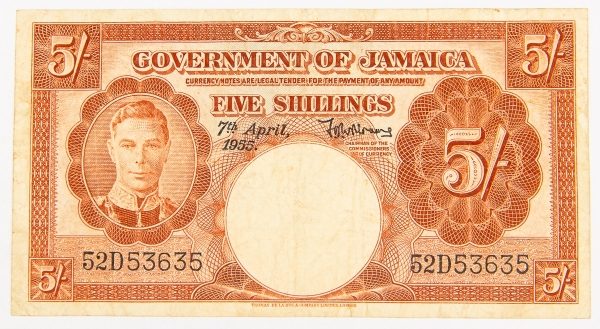 • Numismática, JAMAICA. Uma Cédula P-37 5 Shilling 1955