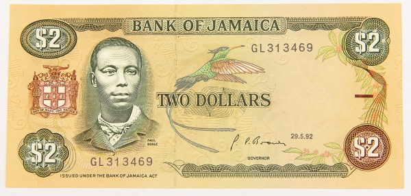 • Numismática, JAMAICA. Uma Cédula P-69 2 Dollars 1992 Flor de Estampa
