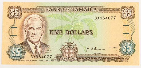 • Numismática, JAMAICA. Uma Cédula P-70 5 Dollars Flor de Estampa