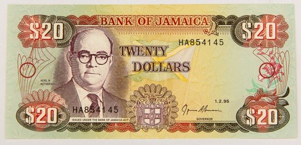 • Numismática, JAMAICA. Uma Cédula P-72 20 Dollars Flor de Estampa