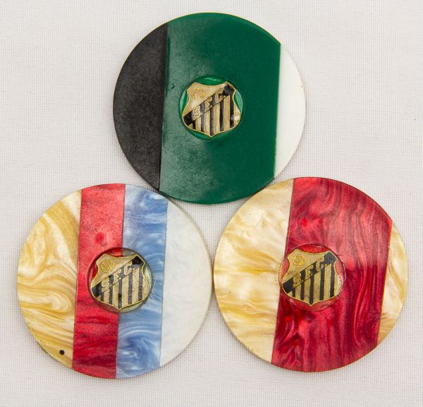 • Colecionismo. Futebol de botão. 3 peças em acrílico e/ou galalite anos 70/80. Santos 5,5 cm.