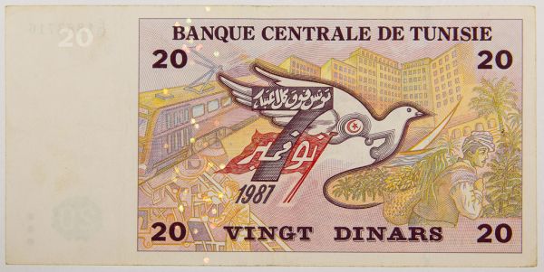 • Numismática, Tunísia. 20 Dinars 1987.