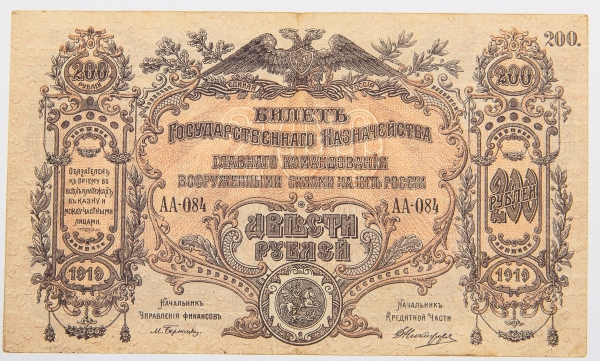 • Numismática, Rússia. Cédula de 200 Rublos 1919 S-423 SOB