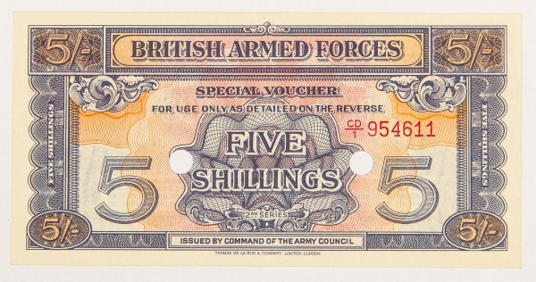• Numismática, Reino Unido. Cédula de 5 Shillings Militar 1948 P-M20d FE