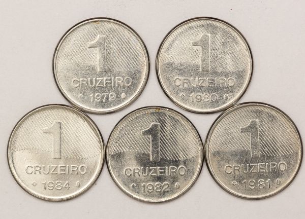 • Numismática, Brasil. Lote com 5 moedas de 1 cruzeiro. Anos 1979, 1980, 1981, 1982 e 1984. Série Cana de Açúcar escassas.