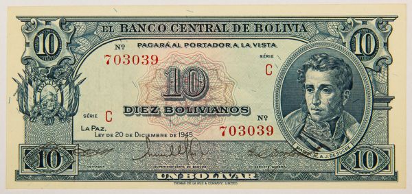 • Numismática, Bolívia. 10 Bolivianos 1945.