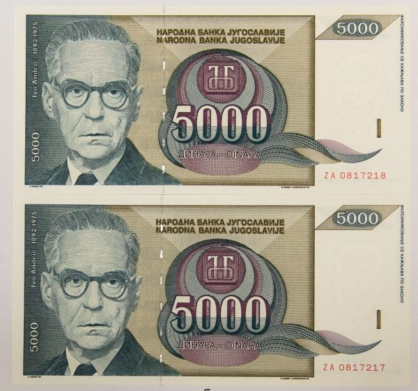 • Numismática, Iugoslávia - 5000 Dinara (2 cédulas Reposição Flor de Estampa Série Z)Replacement.