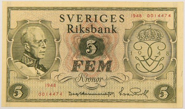 • Numismática, SWEDEN. Uma Cédula 5 Kroner 1948 Flor de Estampa
