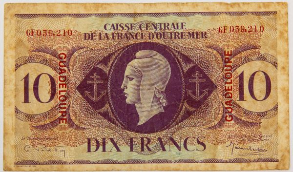 • Numismática, GUADELOUPE. Uma Cédula 10 Francs 1944