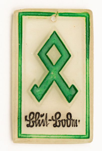 • Militaria, Alemanha II Guerra. Proveniente de importante coleção adquirida em Ciney - Bélgica (Feira gigantesca de Militaria). O partido nazista promoveu uma grande arrecadação de fundos antes e durante a guerra com a venda de grande variedade de itens colecionáveis, pins, pendentes, tinnies, badges etc. Todos colecionáveis para incentivar novas compras. Como referência para estudo e identificação aconselhamos o catálogo Donation Badges, Pins & Pendants of the Third Reich de Joseph Cassidy & Christopher Alexander. Oportunidade para colecionador avançado. *Item não promove ou glorifica violência ou intolerância racial. Está à venda apenas para fins de preservação da memória histórica. A Organização do leilão não faz apologia a quaisquer movimentos políticos ou ideológicos, e repudia qualquer ideologia de cunho racista. Runa em vidro. Pág. 17. DJH-40-1. Solo de Sangue - Blut-Boolen. 33x20 mm.