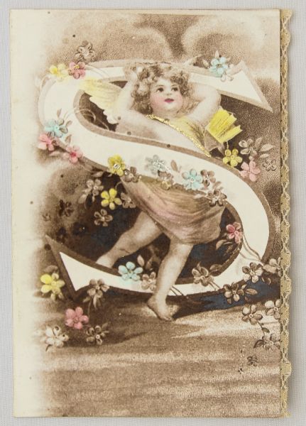 • Colecionismo - Antigo cartão  com a letra `S` e um Anjo complementando a decoração (18 x 12cm)- Possui acabamento em renda na borda principal - Muito utilizado no final do sec XIX início do sec XX - Não tem marcas do fabricante