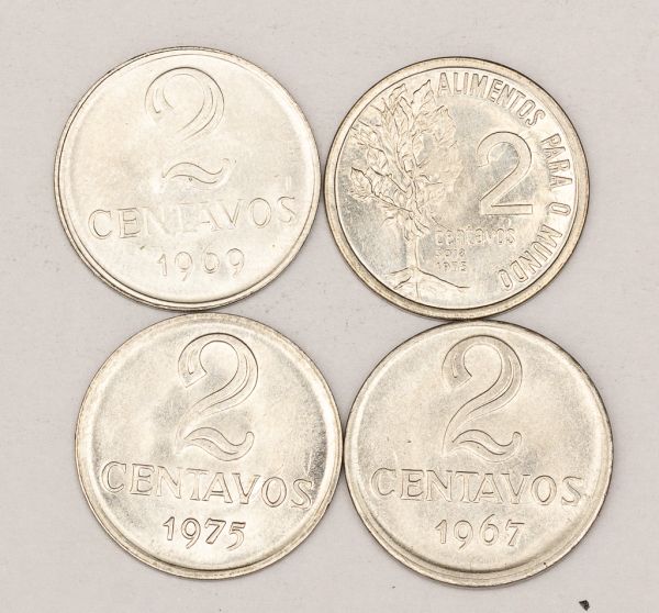 • Numismática, Brasil. Lote com 4 moedas, sendo 2 CENTAVOS 1967, 2 CENTAVOS 1969, 2 CENTAVOS 1975, 2 CENTAVOS 1975