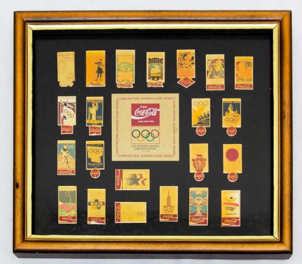 • Colecionismo - Quadro decorativo com 22 Pins dos jogos olimpicos com logo da Coca Cola + placa central decorativa da Coca Cola