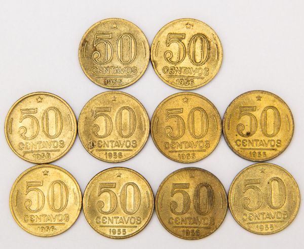• Numismática, Brasil. 10 Moedas 50 Centavos 1955-1956 Flor de Cunho.