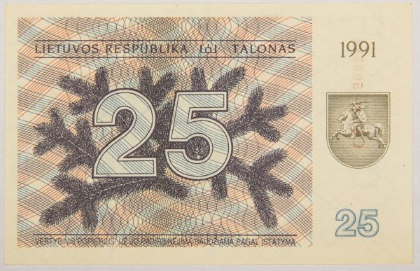 • Numismática, LIETUVA. Uma Cédula 25 Talonas 1991 Flor de Estampa