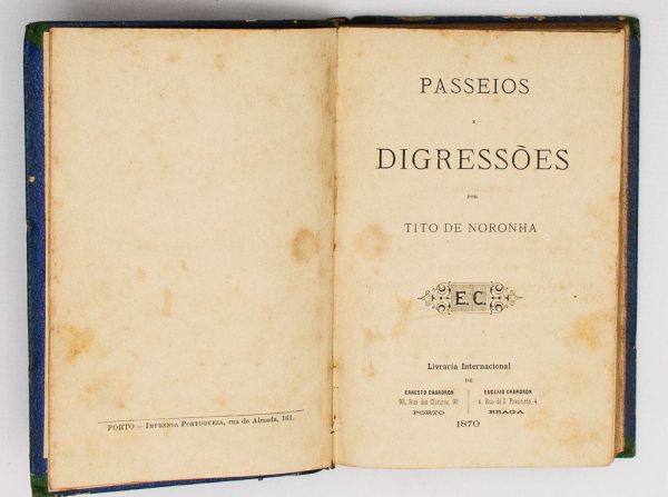 • Livro: NORONHA, Tito de. `Passeios e Digressões`, Romance, 1ª edição. Porto/Braga: Livraria Internacional de Ernesto/Eugênio Chardron, 1870; 240p. Enc. Carimbo de extinta biblioteca particular na fl. de guarda.