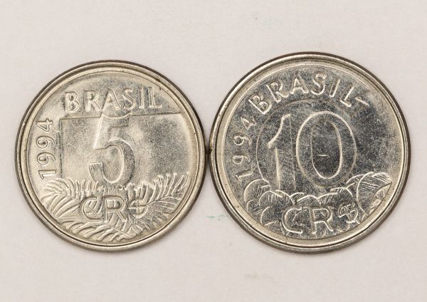 • Numismática, Brasil. Série com 2 Moedas 5 e 10 Cruzeiros Reais 1994 Arara e Tamanduá - V. 431 e V. 433 Escassas FC (Flor de Cunho)