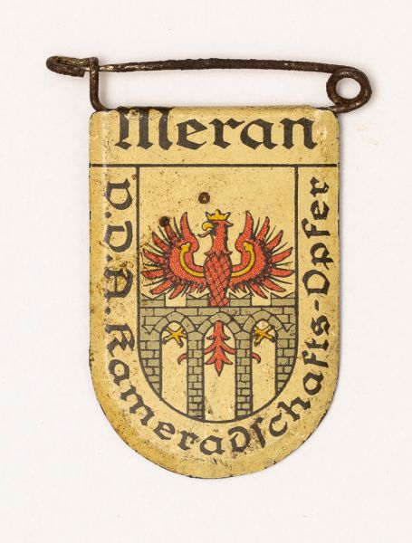 • Militaria, Alemanha II Guerra. Proveniente de importante coleção adquirida em Ciney - Bélgica (Feira gigantesca de Militaria). O partido nazista promoveu uma grande arrecadação de fundos antes e durante a guerra com a venda de grande variedade de itens colecionáveis, pins, pendentes, tinnies, badges etc. Todos colecionáveis para incentivar novas compras. Como referência para estudo e identificação aconselhamos o catálogo Donation Badges, Pins & Pendants of the Third Reich de Joseph Cassidy & Christopher Alexander. Oportunidade para colecionador avançado. *Item não promove ou glorifica violência ou intolerância racial. Está à venda apenas para fins de preservação da memória histórica. A Organização do leilão não faz apologia a quaisquer movimentos políticos ou ideológicos, e repudia qualquer ideologia de cunho racista. 1934. Brasão de cidade fora da Alemanha contendo significativo número de alemães. Pág. 225 a 228. 33x25 mm. Meran (Itália).