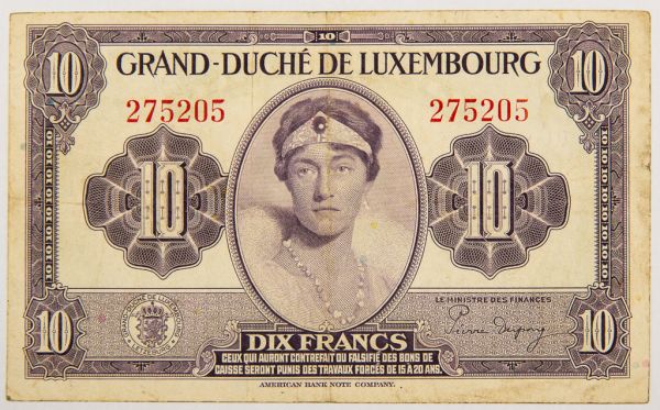 • Numismática, LUXEMBOURG. Uma Cédula 10 Francs