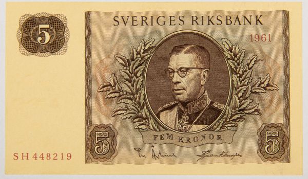 • Numismática, SWEDEN. Uma Cédula 5 Kroner 1961 Flor de Estampa