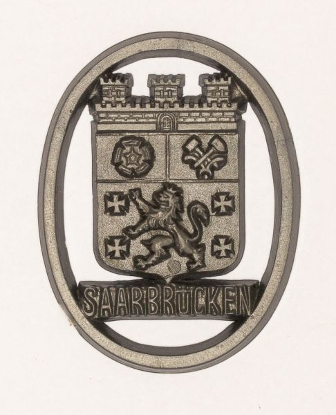 • Militaria, Alemanha II Guerra. Proveniente de importante coleção adquirida em Ciney - Bélgica (Feira gigantesca de Militaria). O partido nazista promoveu uma grande arrecadação de fundos antes e durante a guerra com a venda de grande variedade de itens colecionáveis, pins, pendentes, tinnies, badges etc. Todos colecionáveis para incentivar novas compras. Como referência para estudo e identificação aconselhamos o catálogo Donation Badges, Pins & Pendants of the Third Reich de Joseph Cassidy & Christopher Alexander. Oportunidade para colecionador avançado. *Item não promove ou glorifica violência ou intolerância racial. Está à venda apenas para fins de preservação da memória histórica. A Organização do leilão não faz apologia a quaisquer movimentos políticos ou ideológicos, e repudia qualquer ideologia de cunho racista. 1941 - Brasão de armas da fronteira alemã ou cidade ocupada. 38x29 mm. Pág. 237/38. Saarbrucken.