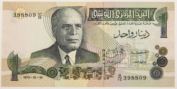 • Numismática, Tunísia. Cédula de 1 Dinar 1973 P-70 FE