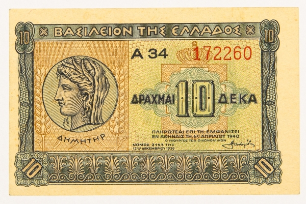 • Numismática, Grécia. Cédula de 10 Dracmas 1940 P-314