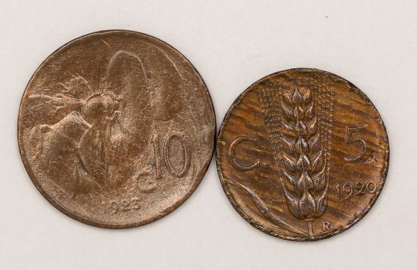 • Numismática, Itália. 5 e 10 Centesimi 1920 e 1923. Bronze, 20 e 23mm, Rei Vitório Emanuele III, KMH 59-Y61 / KMH 60-Y62.