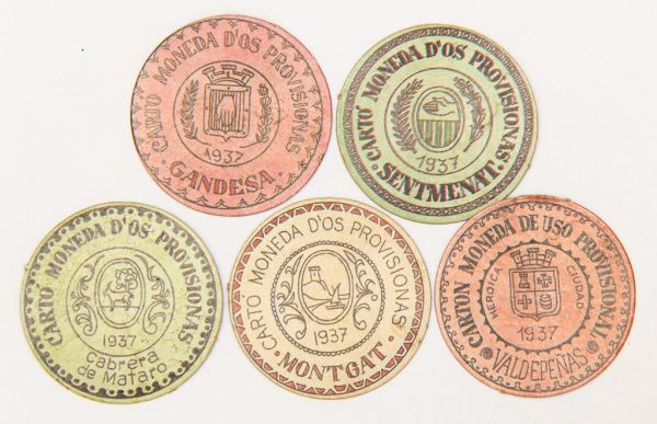• Numismática, Espanha. Moeda Provisional lastreada com selo devido a falta de moeda circulante. 1937. 5 peças. 35mm