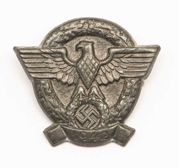 • Militaria, Alemanha II Guerra. Proveniente de importante coleção adquirida em Ciney - Bélgica (Feira gigantesca de Militaria). O partido nazista promoveu uma grande arrecadação de fundos antes e durante a guerra com a venda de grande variedade de itens colecionáveis, pins, pendentes, tinnies, badges etc. Todos colecionáveis para incentivar novas compras. Como referência para estudo e identificação aconselhamos o catálogo Donation Badges, Pins & Pendants of the Third Reich de Joseph Cassidy & Christopher Alexander. Oportunidade para colecionador avançado. *Item não promove ou glorifica violência ou intolerância racial. Está à venda apenas para fins de preservação da memória histórica. A Organização do leilão não faz apologia a quaisquer movimentos políticos ou ideológicos, e repudia qualquer ideologia de cunho racista. 1942 - TDP-42-1.1. Águia da Polícia. Pág. 135. Rara.