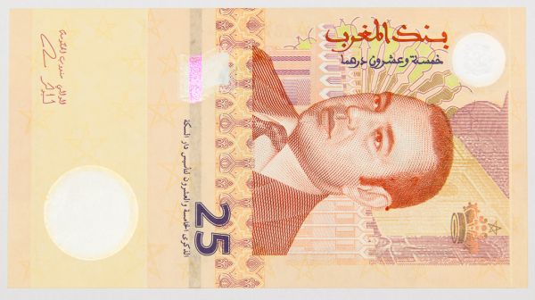 • Numismática, Marrocos. Cédula de 25 Dirhams Comemorativa aos 25 Anos da Casa da Moeda Nacional. P-73 FE