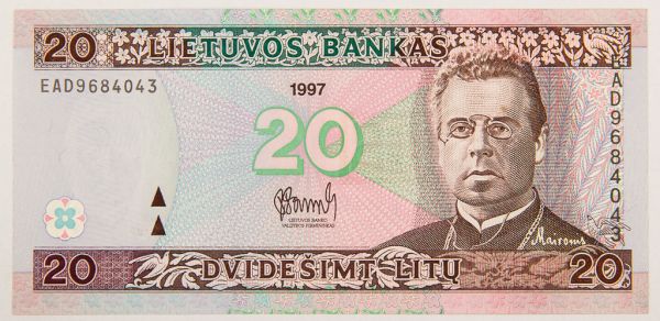 • Numismática, LIETUVA. Uma Cédula 20 Litu 1997 Flor de Estampa