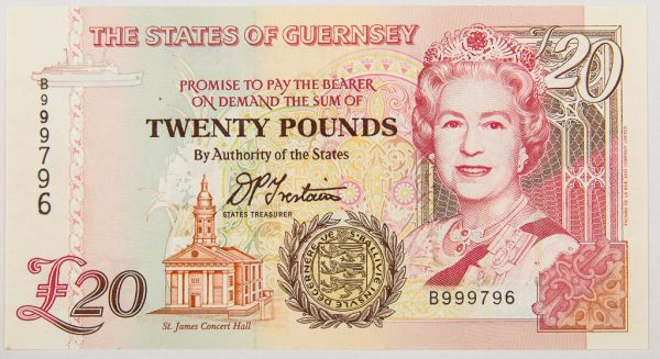• Numismática, GUERNSEY. Uma Cédula P-58 20 Pounds 1996 Flor de Estampa