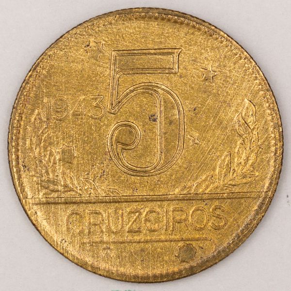 • Numismática, Brasil. Moeda de 5 Cruzeiros Ano 1943 Bronze e Alumínio - Tiragem 222.000 (Rara neste estado de conservação) V. 253