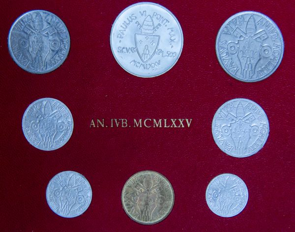 • Numismática, Vaticano. Cartela em Flor de Cunho com 8 peças,  incluindo 500 liras em prata. Ano 1975