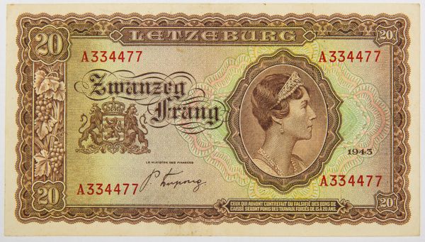 • Numismática, LUXEMBOURG. Uma Cédula 20 Francs 1943
