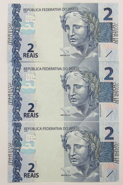 • Numismática, Brasil. Lote com 3 cédulas de 2 Reais sendo LJ018567691, LJ018567692, LJ018567693 seriadas escassas Flor de Estampa.