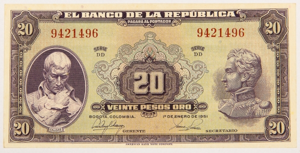 • Numismática, Colômbia. Cédula de 20 Pesos Oro 1951 P-392d FE