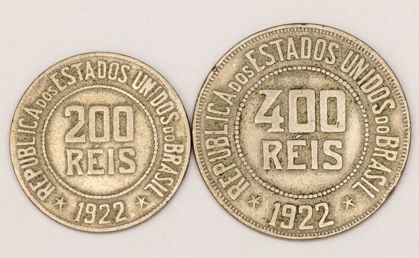 • Numismática, Brasil. Lote com 2 moedas, sendo 200 RÉIS 1922, 400 RÉIS 1922