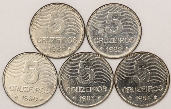 • Numismática, Brasil. Série com 5 moedas de 5 cruzeiros. Anos 1980, 1981, 1982, 1983 e 1984. Série Café escassas.