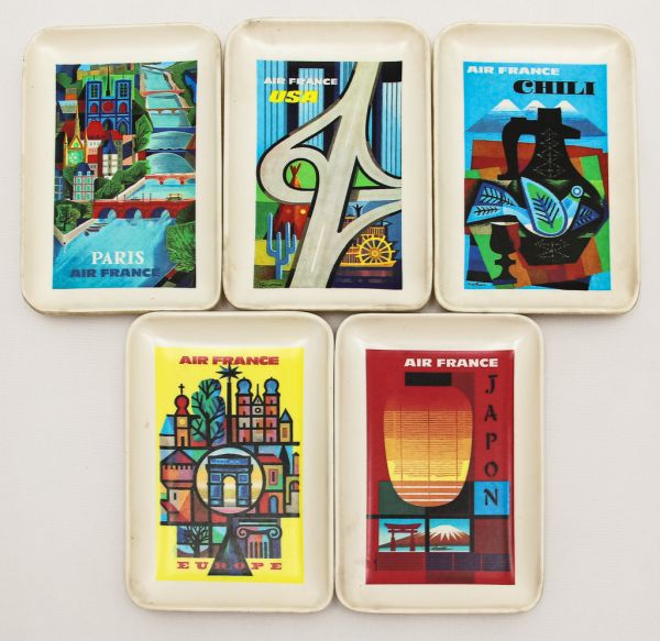 • Colecionismo - Antigo Conjunto de 5 pratos do serviço de bordo da Air France - Todos decorados com motivos de países ou cidades servidas pela cia Aérea (Usa,frança, Chile, Japão) - Insignificantes marcas de uso nas peças