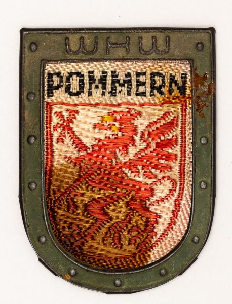 • Militaria, Alemanha II Guerra. Proveniente de importante coleção adquirida na Bélgica - Feira de Militaria de Ciney. O partido nazista promoveu uma grande campanha de arrecadação de fundos antes e durante a guerra, com a venda de itens colecionáveis, pins, pendentes, tinnies, badges etc. Sempre colecionáveis voltada a novas compras. Oportunidade para colecionador avançado. **Item não promove ou glorifica violência ou intolerância racial. Está à venda apenas para fins de preservação da memória histórica. A Organização do leilão não faz apologia a quaisquer movimentos políticos ou ideológicos, e repudia qualquer ideologia de cunho racista. Campanha de Inverno WHW em tecido e metal. Pommern - no estado. 31x43 mm.