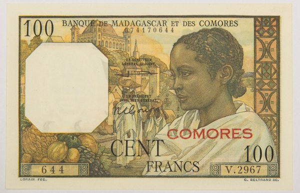 • Numismática, COMORES. Uma Cédula 100 Francs Flor de Estampa
