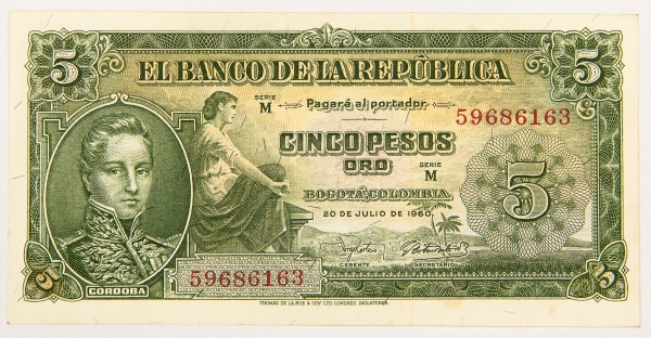 • Numismática, Colômbia. Cédula de 5 Pesos Oro 1960 P-405 FE