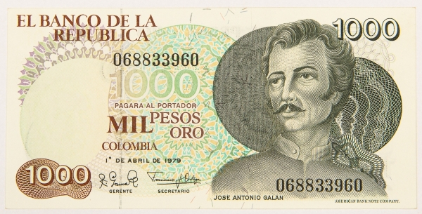 • Numismática, Colômbia. Cédula de 1000 Pesos Oro 1979 P-421a FE