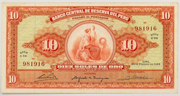 • Numismática, Peru. 10 soles. 1965. Linda.